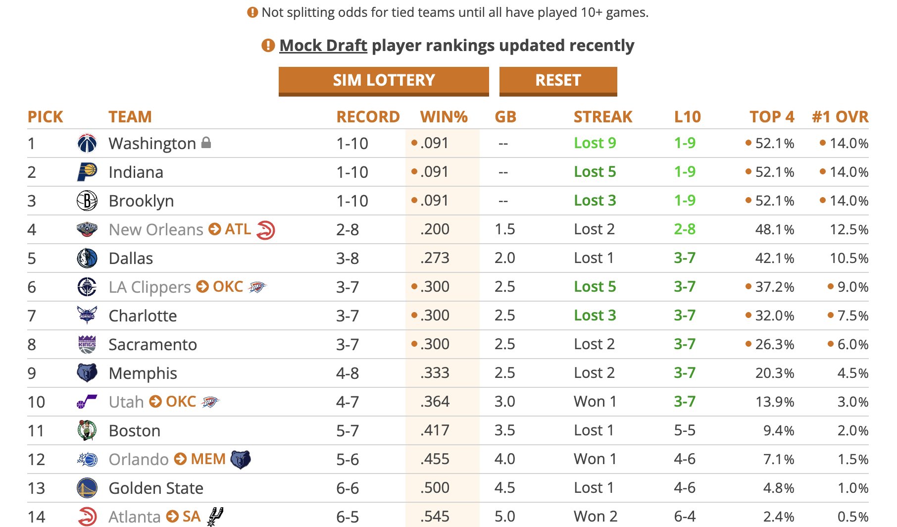 6686体育app11月12日讯 美媒Tankathon根据当前联盟各队的战绩,今日更新了2026年选秀抽签的概率,奇才、步行者、篮网三队由于战绩都是1胜10负,抽到状元签的概率都是14%,抽到前四顺位的概率为52.1%。