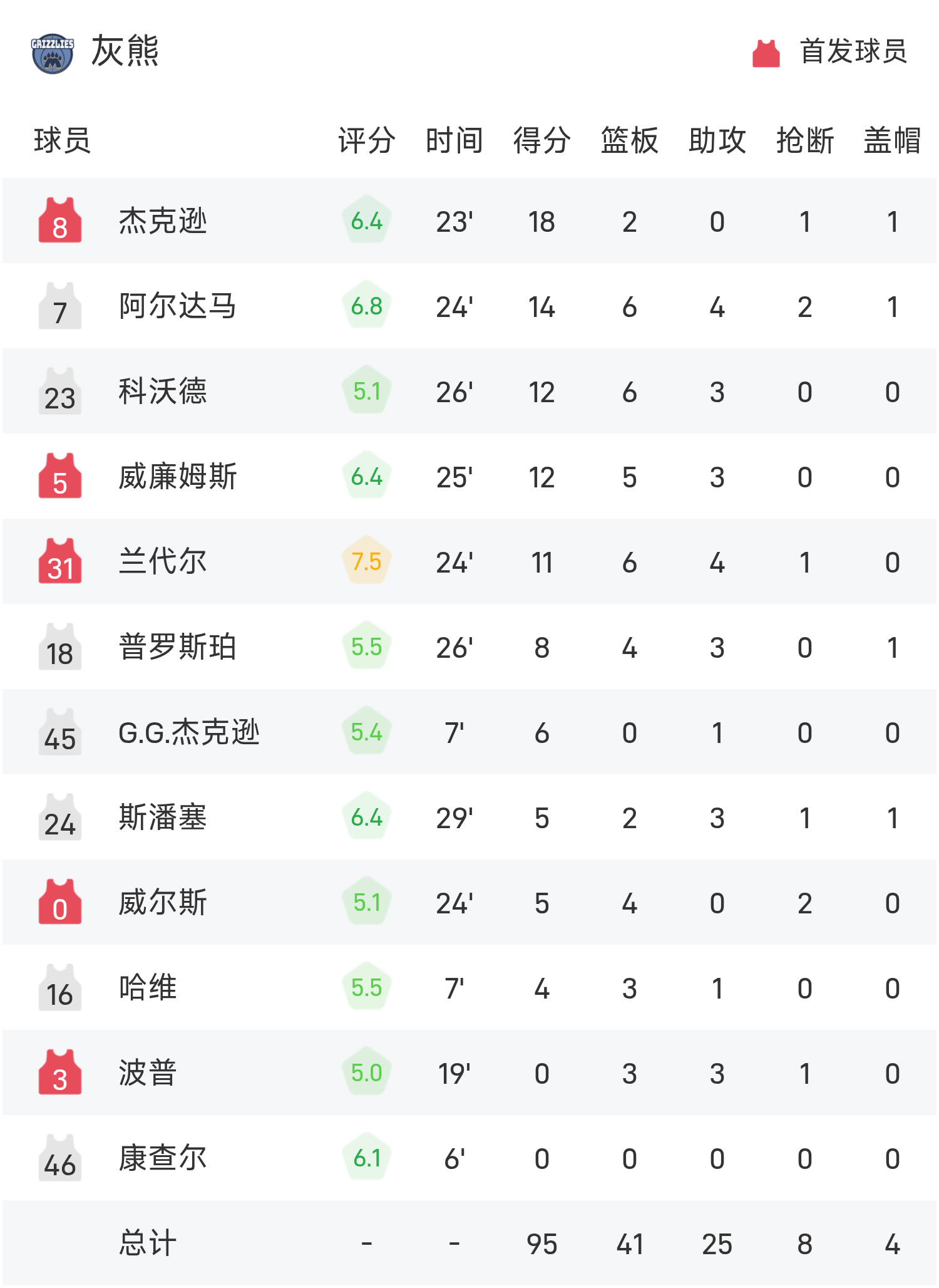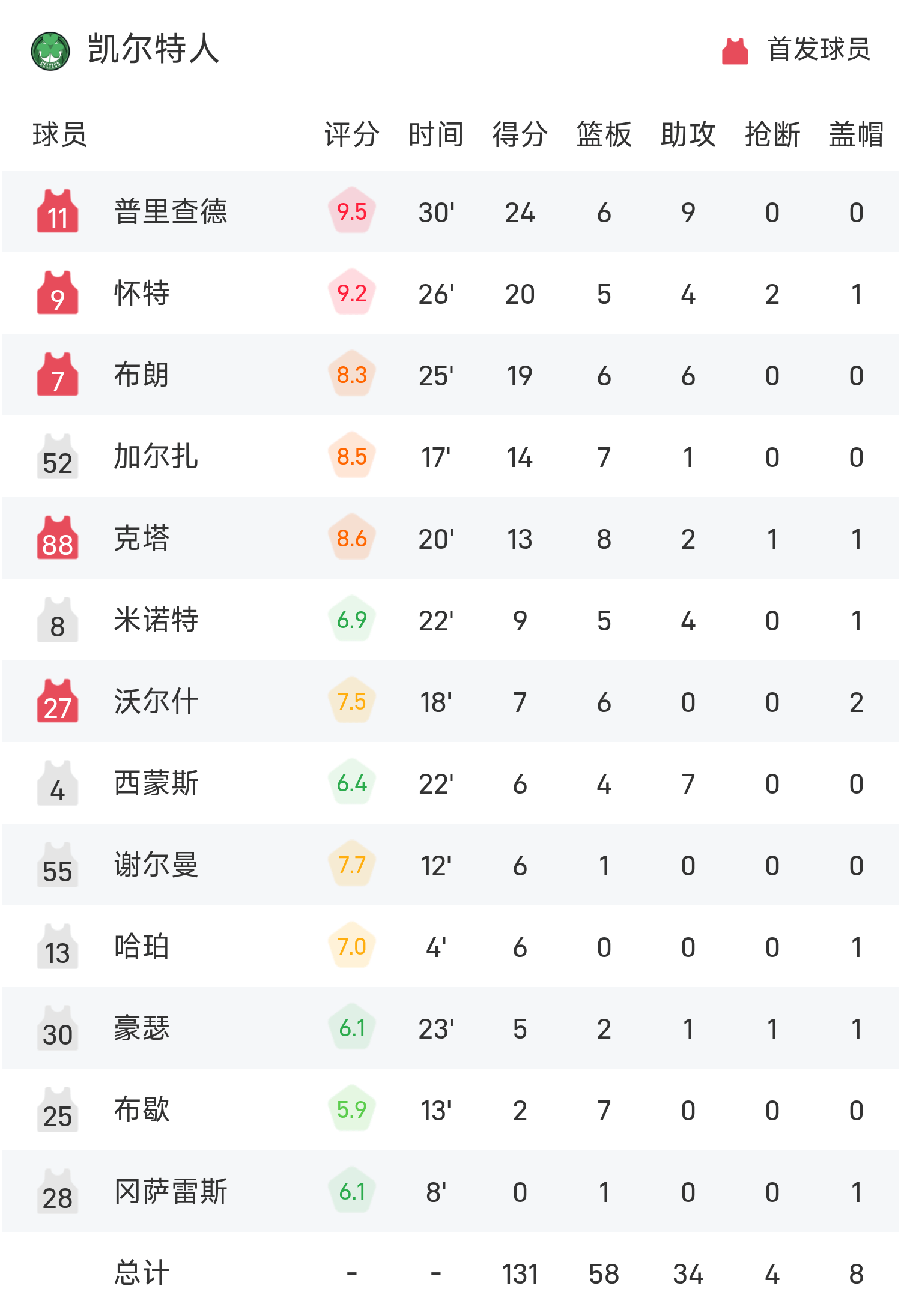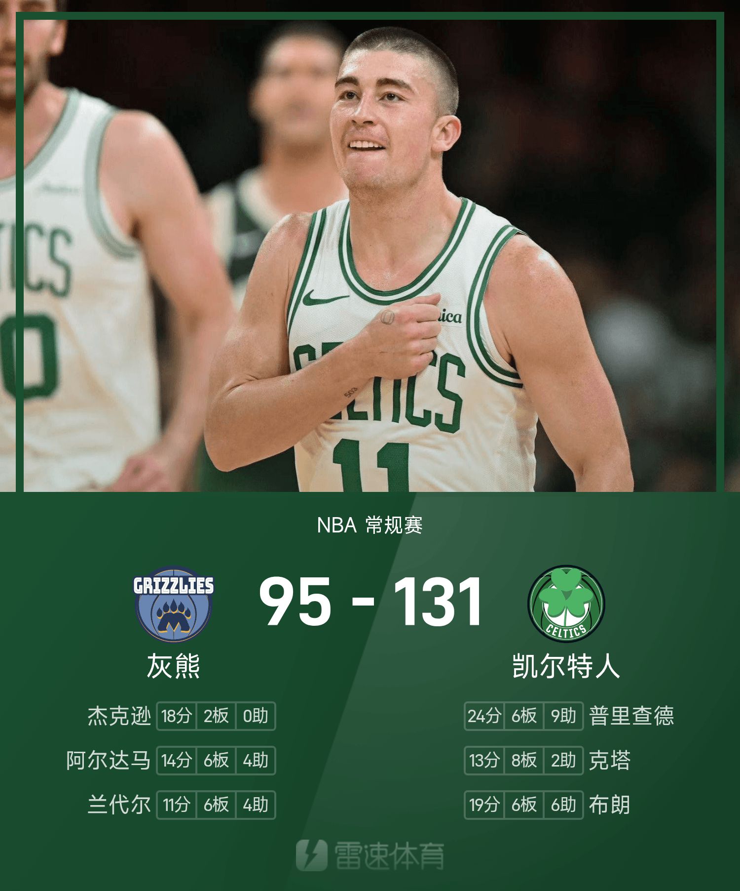 双方全场战罢,凯尔特人131-95战胜灰熊。
