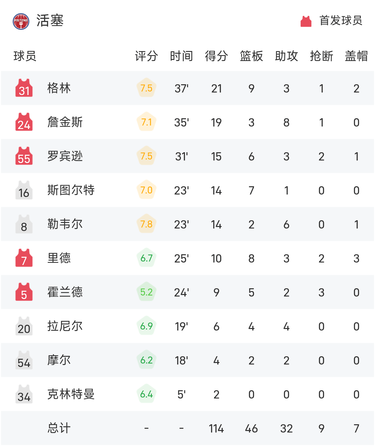6686体育app11月15日讯 25/26赛季NBA 常规赛 NBA杯分组赛,活塞对阵76人。双方全场战罢,活塞114-105战胜76人。格林得到21分9板3助率队取胜,马克西空砍全场最高的31分7板3助。