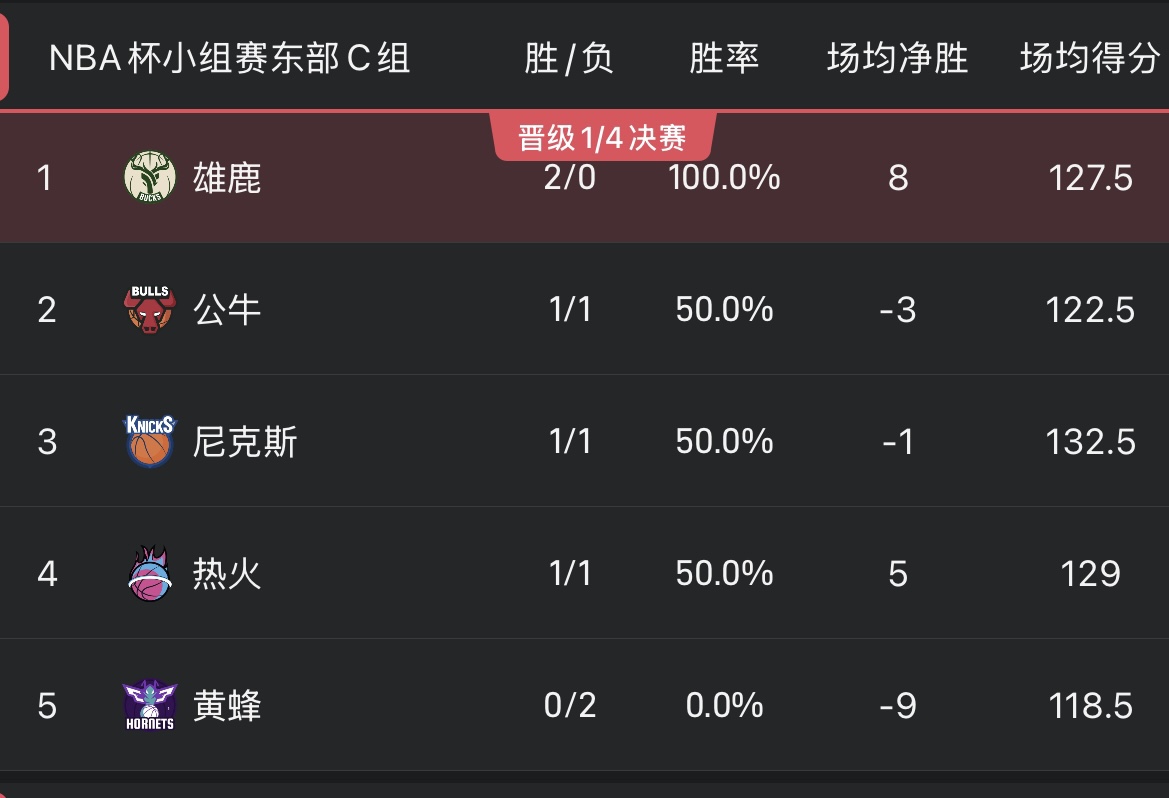 NBA杯即时排名:多队取得2胜0负,西部C组5队均1胜1负