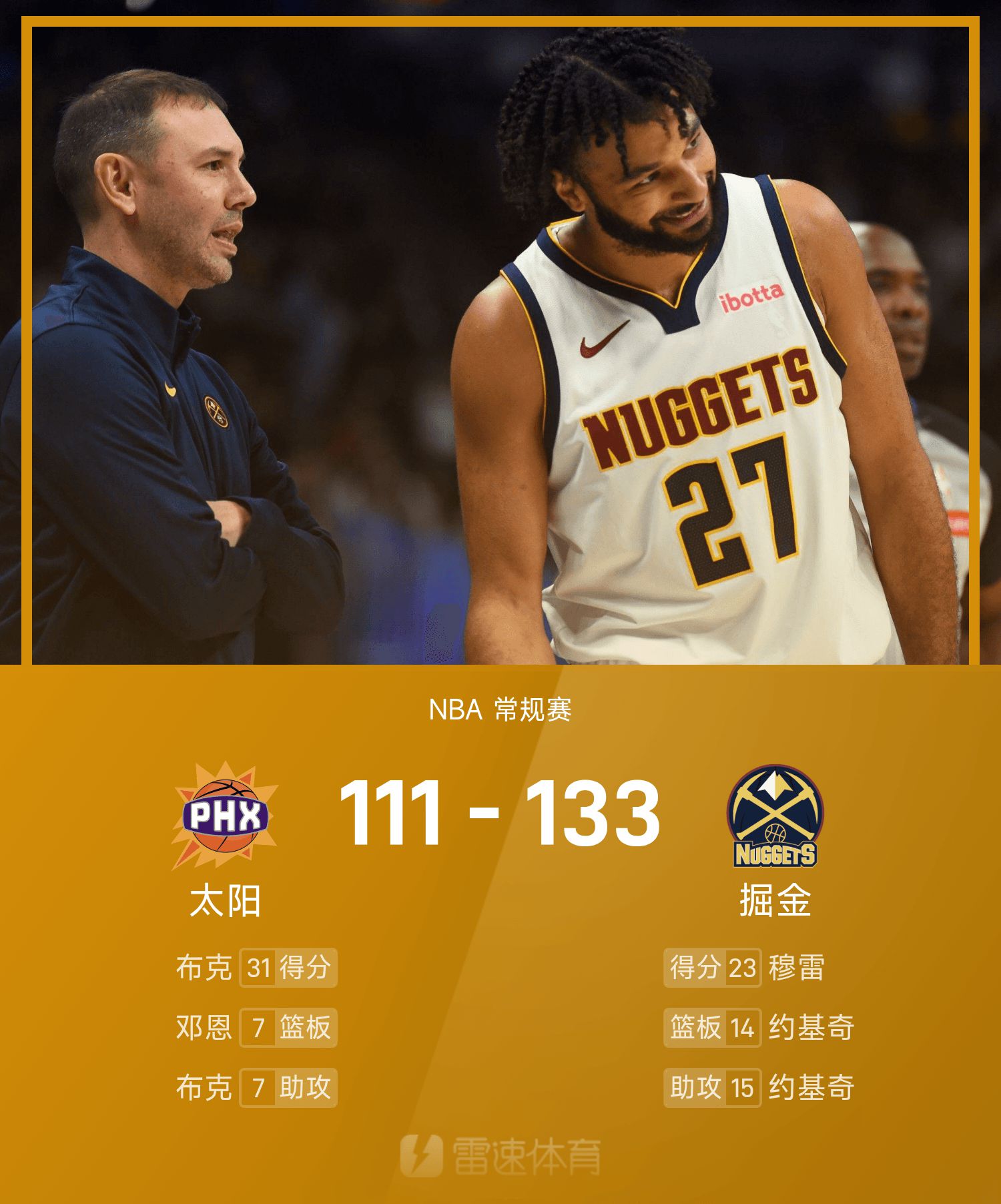掘金后卫穆雷得到23分6抢篮板5助攻,内线核心约基奇三节即三双,得到14分14抢篮板15助攻,连续两场竞赛得到三双。