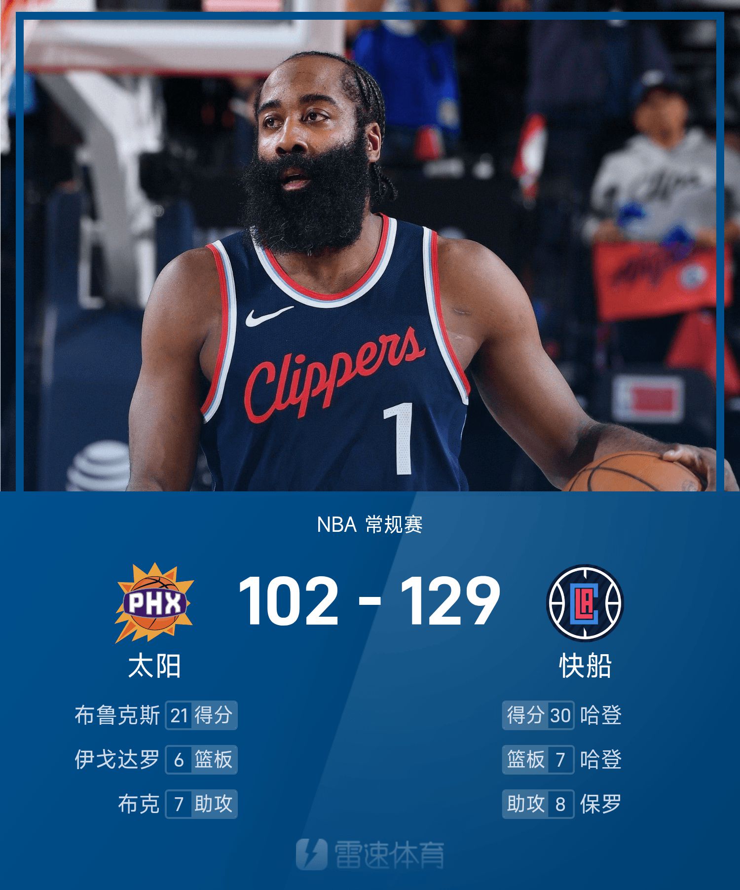 NBA战报:哈登30分7板7助,快船129-102大胜太阳