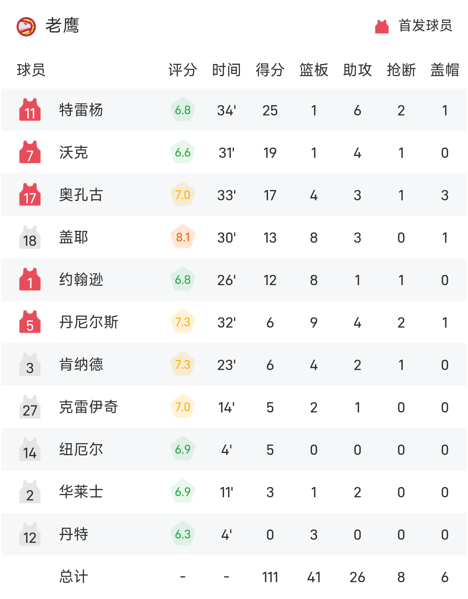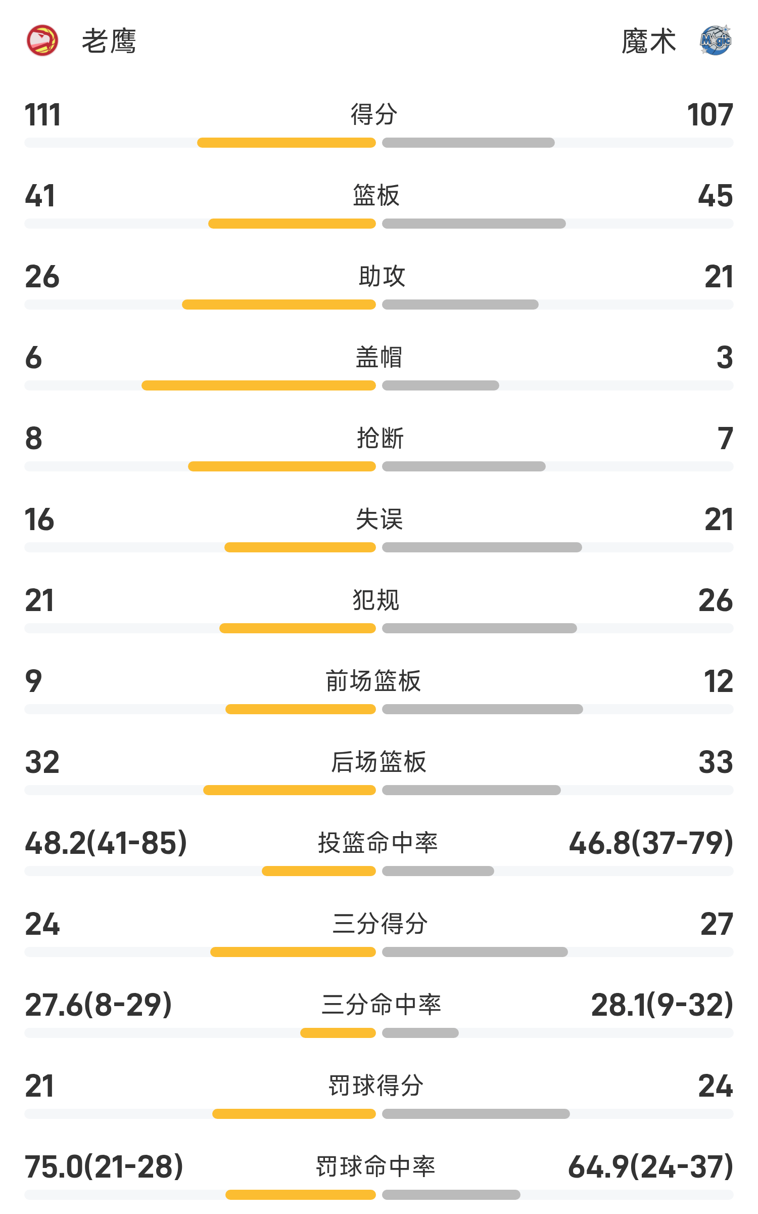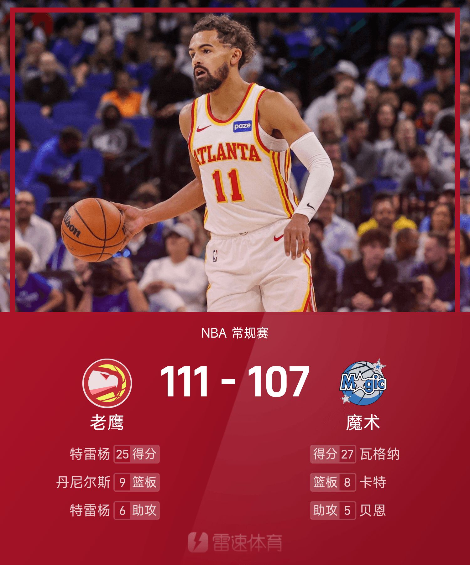NBA战报:特雷·杨25分6助,老鹰111-107险胜魔术