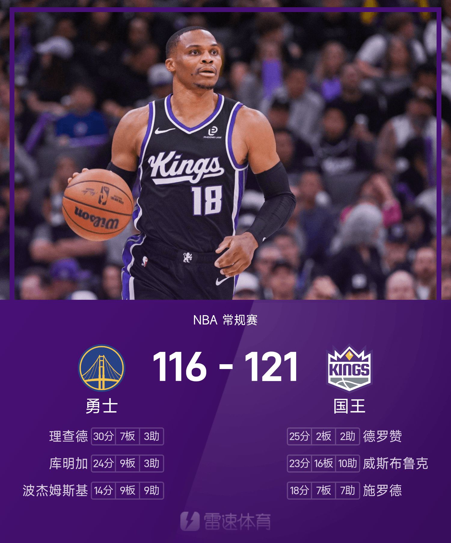 NBA战报:威少三双&关键截球,国王121-116击败勇士