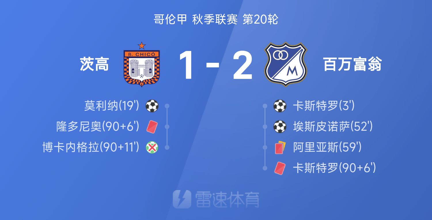 6686体育app11月13日讯 25赛季哥伦甲秋季联赛事第20轮,百万富翁2-1战胜茨高。全场竞赛,埃斯皮诺萨发挥出色贡献1射1传,卡斯特罗破门建功,莫利纳破门难救主,博卡内格拉在最后时刻读秒失点,卡斯特罗、隆多尼奥染红。