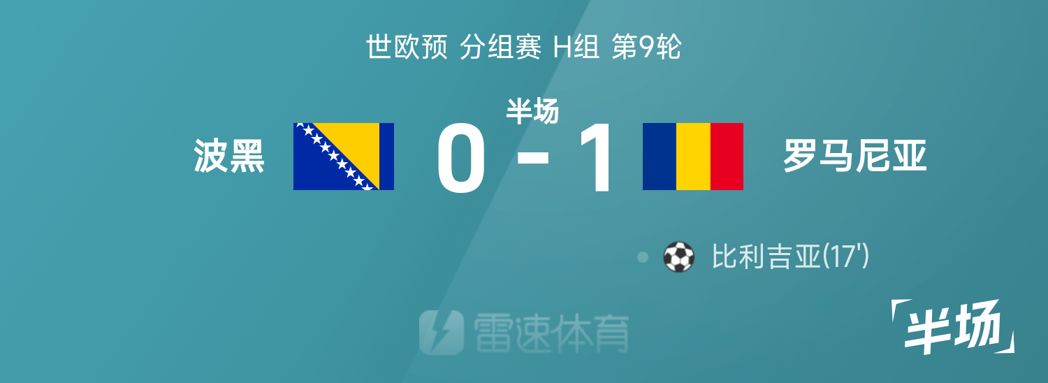 世欧预半场:比利吉亚建功,罗马尼亚暂1-0波黑