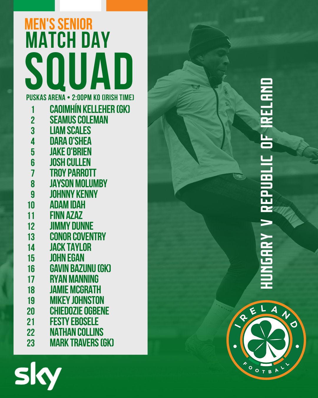 6686体育app11月16日讯 今晚世欧预分组赛F组,爱尔兰客队场挑战匈牙利。赛前,爱尔兰队官方社媒发布本轮大名单: