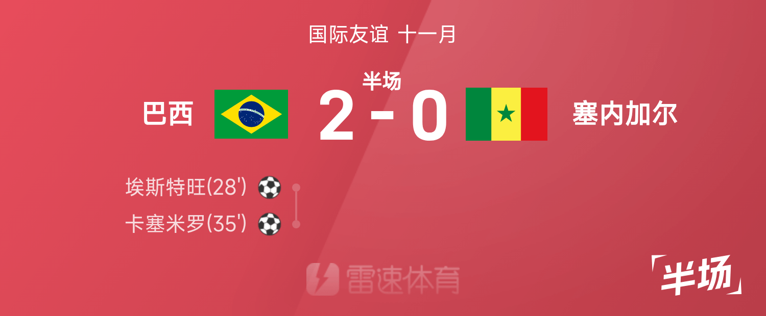 国际友谊半场:埃斯特旺、卡塞米罗破门,巴西2-0塞内加尔