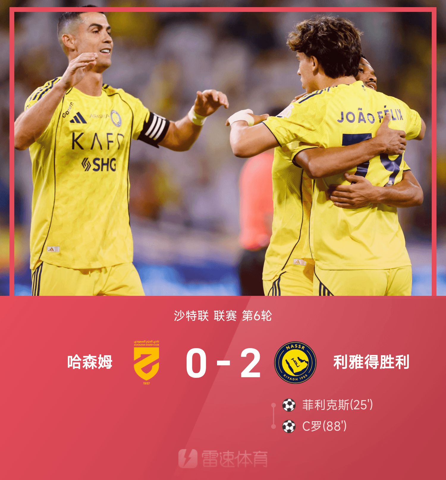 沙特联战报:C罗、菲利克斯破门,利雅得胜出局2-0哈森姆