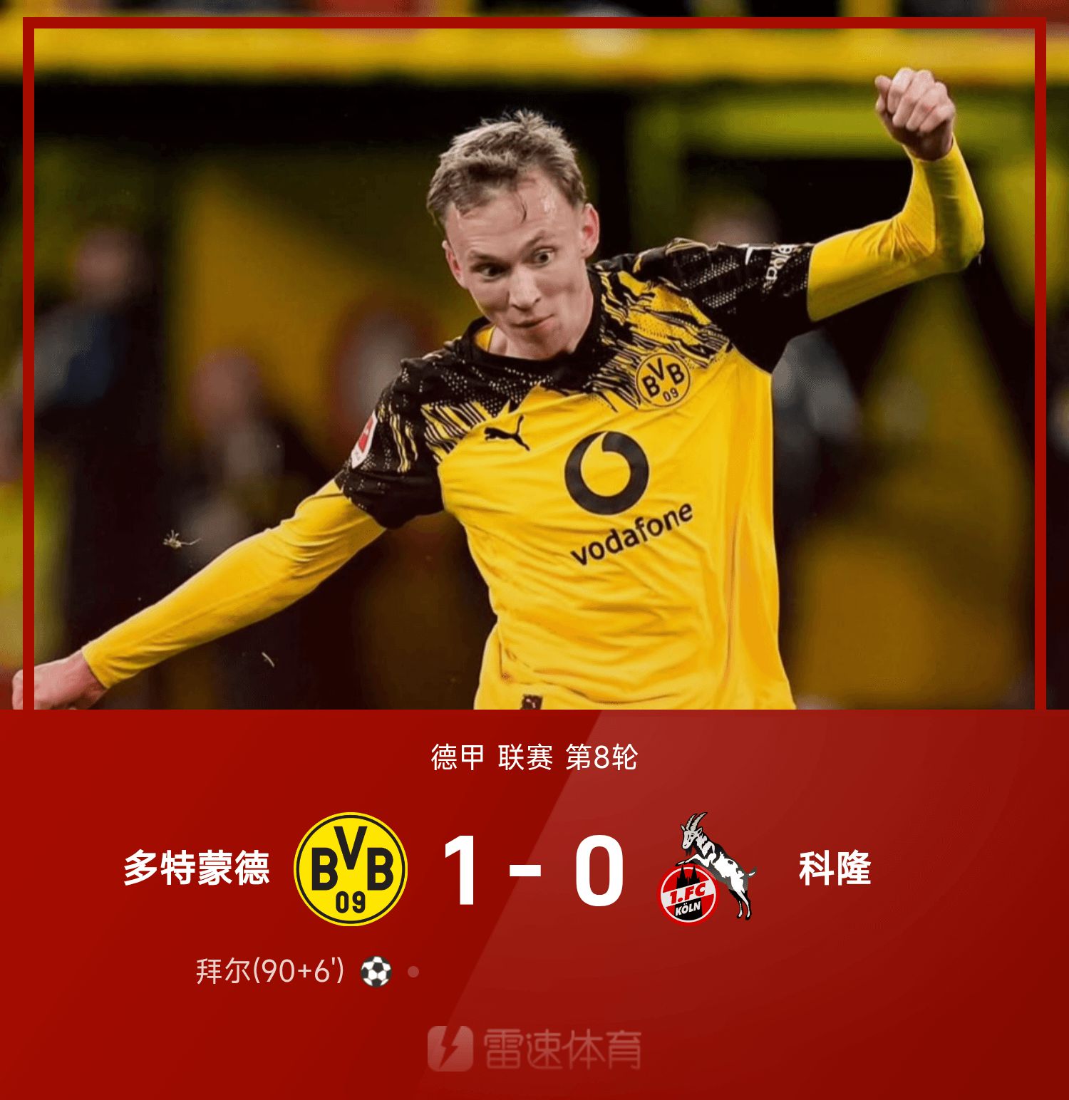 德甲战报:斯克韦伯屡献神扑,拜尔补时最后一投,多特1-0科隆