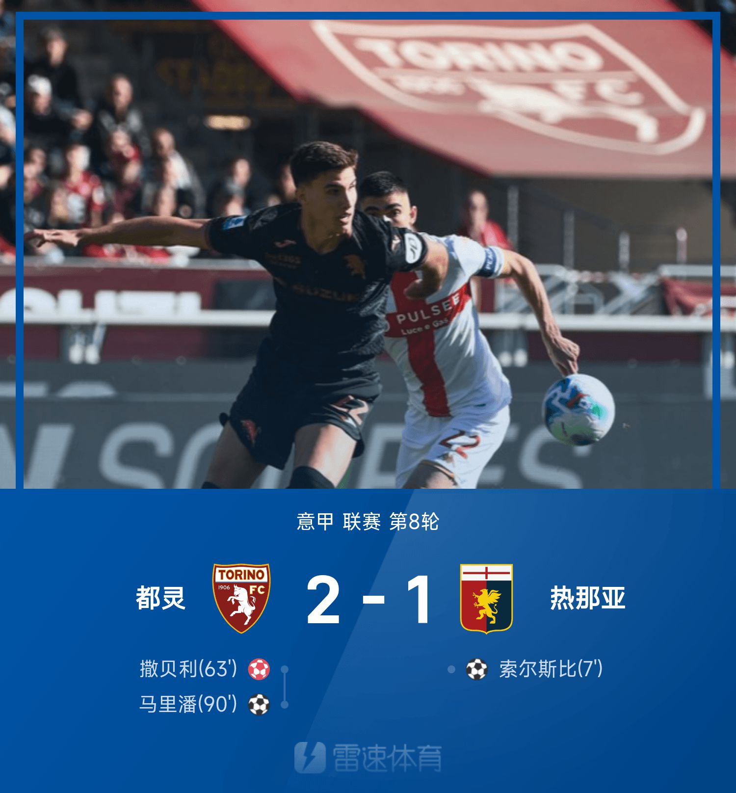意甲战报:撒贝利送乌龙,马里潘最后一投,都灵2-1逆转热那亚