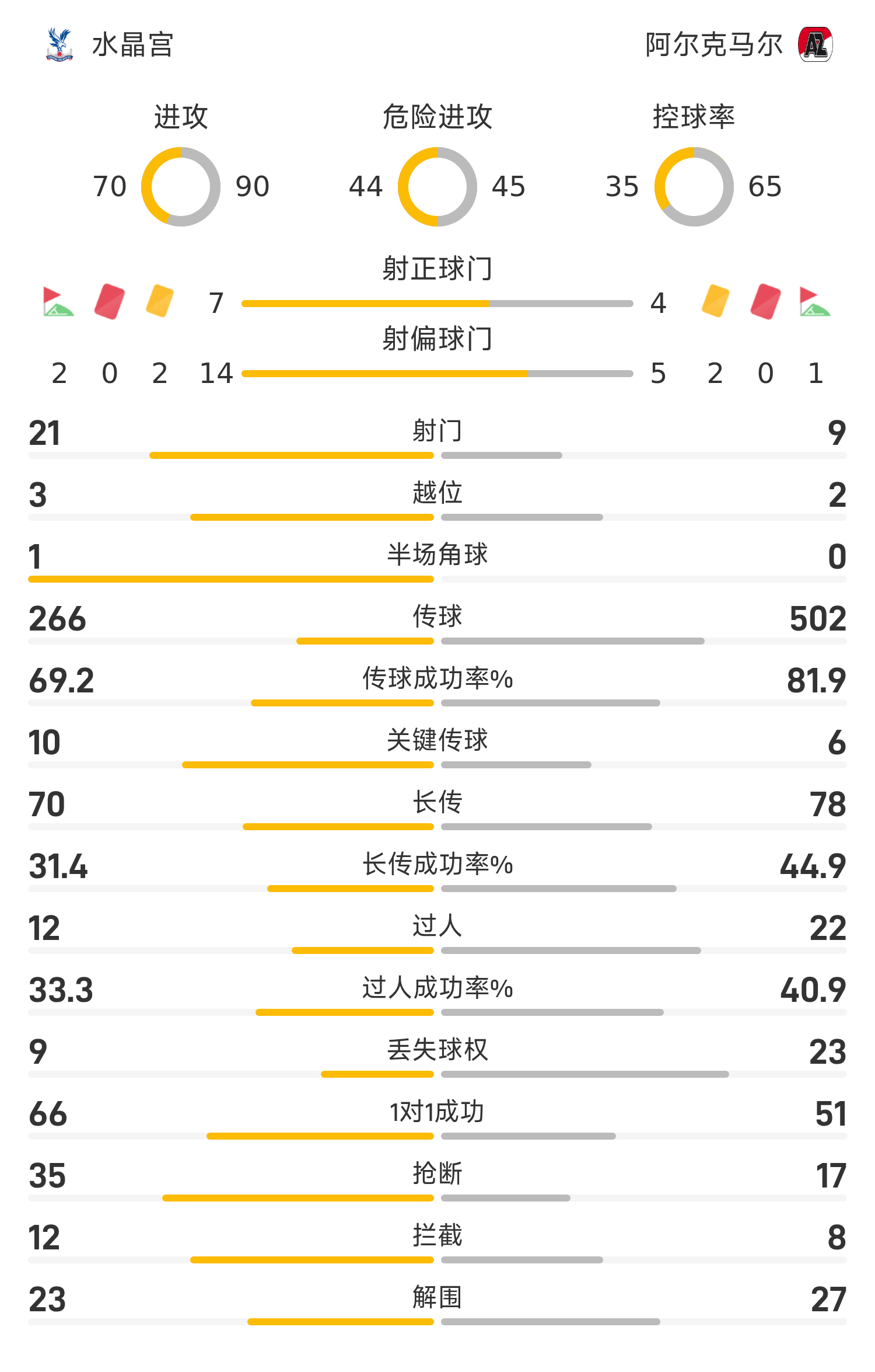 水晶宫首发阵容:1-亨德森、6-格伊、5-拉克鲁瓦、26-理查兹、19-休斯(65’20-沃顿)、8-莱尔马、7-萨尔(65’18-镰田大地)、2-穆尼奥斯(86’17-克莱因)、3-米切尔、10-皮诺(73’55-德文尼)、14-马特塔(86’12-乌切)
